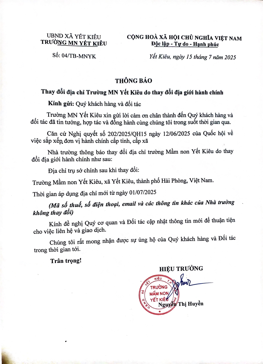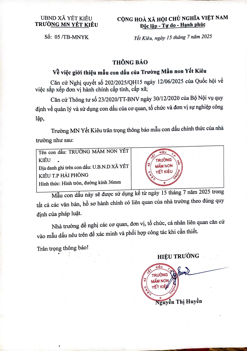 Thông báo thay đổi địa chỉ và giới thiệu mẫu con dấu trường mầm non Yết Kiêu ...